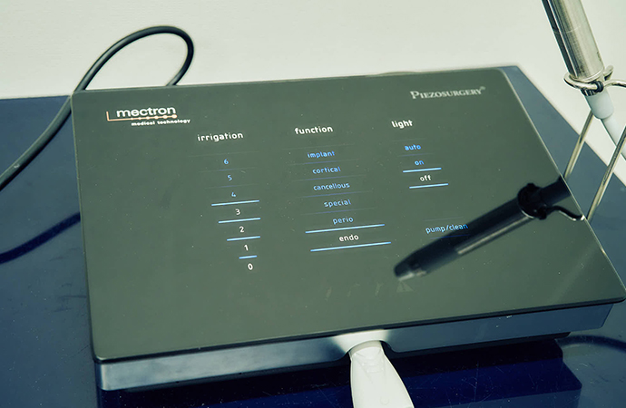 ピエゾサージェリーは、3次元の超音波の振動を利用して、歯や骨など硬い組織だけを切削する手術用機器です。粘膜や神経、血管などの軟らかい組織を傷つけないため、安全で精密な処置を行えます。また、切削の深さや範囲を細かく調整できるため、歯周病の歯石取りから、精度が求められるインプラント治療まで高い効果を発揮します。