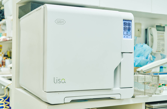 ヨーロッパ規格で最高基準にあたる「クラスB」滅菌器を導入しています。高圧蒸気により複雑な形状の器具まで確実に徹底的に滅菌。治療に使用する全ての器具を清潔に保つ徹底した衛生管理で、安全な診療環境を維持しています。