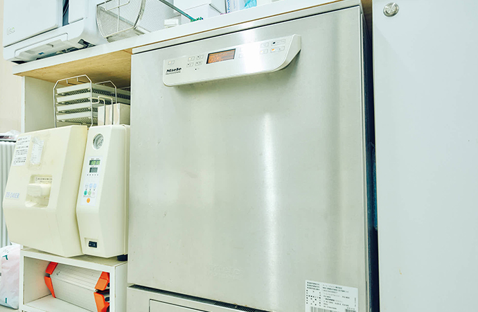 ミーレ ジェットウォッシャーは、歯科用の器具を水と専用洗浄液でしっかり洗い、熱で消毒する機械です。手の届かない器具の内部まできれいにできるため、安心・安全に治療を受けていただけます。