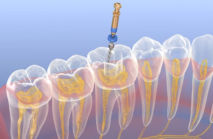 根管治療とは、神経が通る根管内の感染した組織を除去し、洗浄・消毒した上で薬剤を詰め、被せ物で保護する治療です。