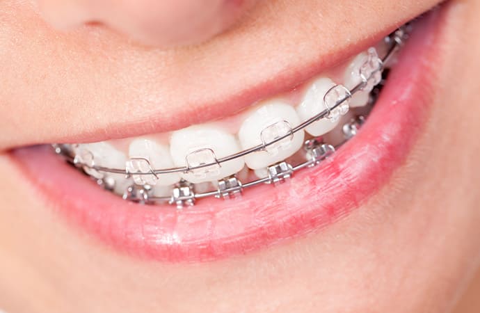 ワイヤーとブラケットを使用する固定式の矯正装置を使用して歯を矯正します。 |