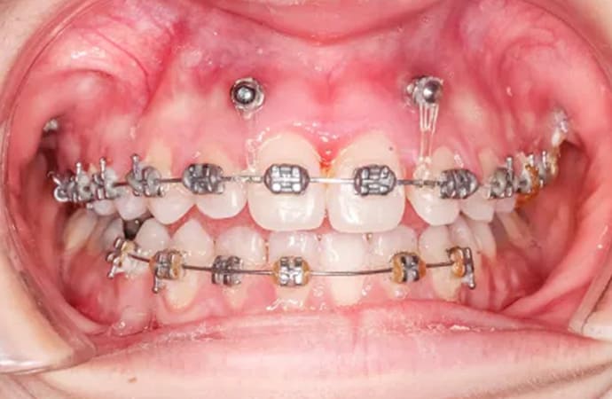 直径約2mmのチタン製ネジ(アンカースクリュー)を利用する矯正歯科治療です。歯茎の骨にアンカースクリューを埋め込み固定源とすることで、歯を後方や下方向など、従来では動かしにくかった方向へもコントロールできます。その結果、これまで難しいとされてきた症例にも対応でき、治療の効率化や期間短縮が期待できます。