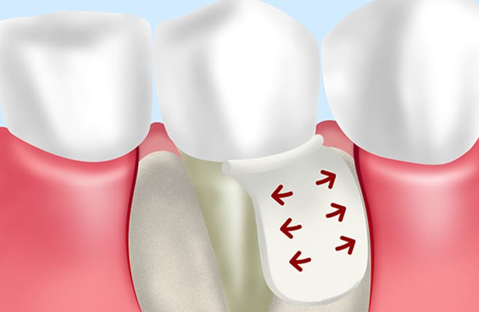まず、歯周ポケット内のプラークや歯石を除去し、「メンブレン」と呼ばれる人工膜を挿入。歯茎の侵入を防ぎながらスペースを確保します。この膜はスペースの確保と共に歯周組織の再生を誘導し、歯槽骨や歯根膜が再び形成されるのを助けます。組織の自然な回復力を活かし、失われた歯周組織の再構築を目指す治療法です。