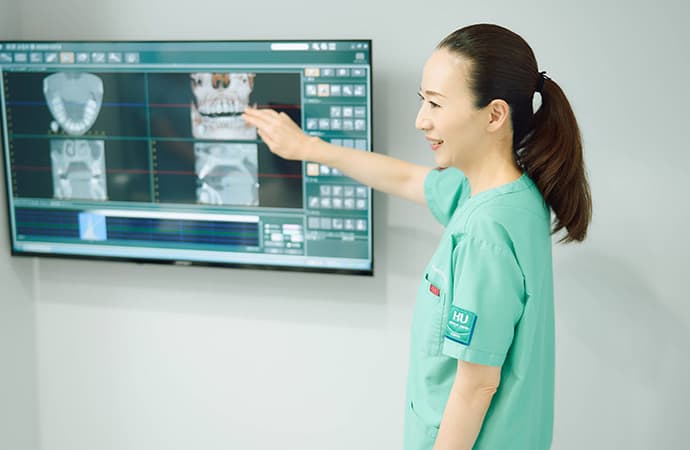 従来のレントゲンでは確認できない歯の生え方や形状、骨の状態・神経・血管の位置を立体的に把握。その上で、患者様の身体に配慮しながら、痛み・腫れ・リスクを最小限に抑えた抜歯を行います。